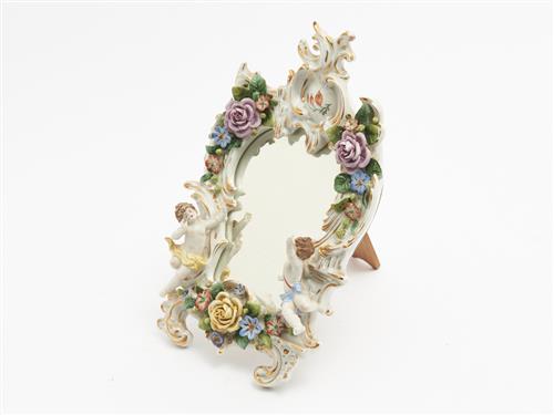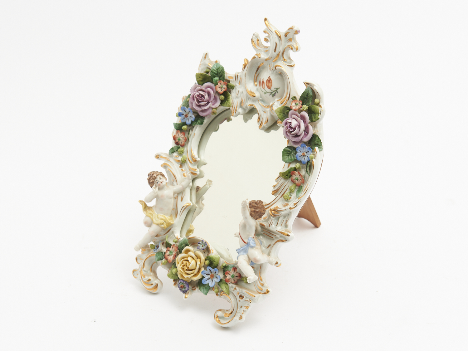 A GERMAN SIGNED DRESDEN CHERUB ADORNED FLORAL TABLE MIRROR H.30CM, LEONARD JOEL LOCAL DELIVERY: SMALL