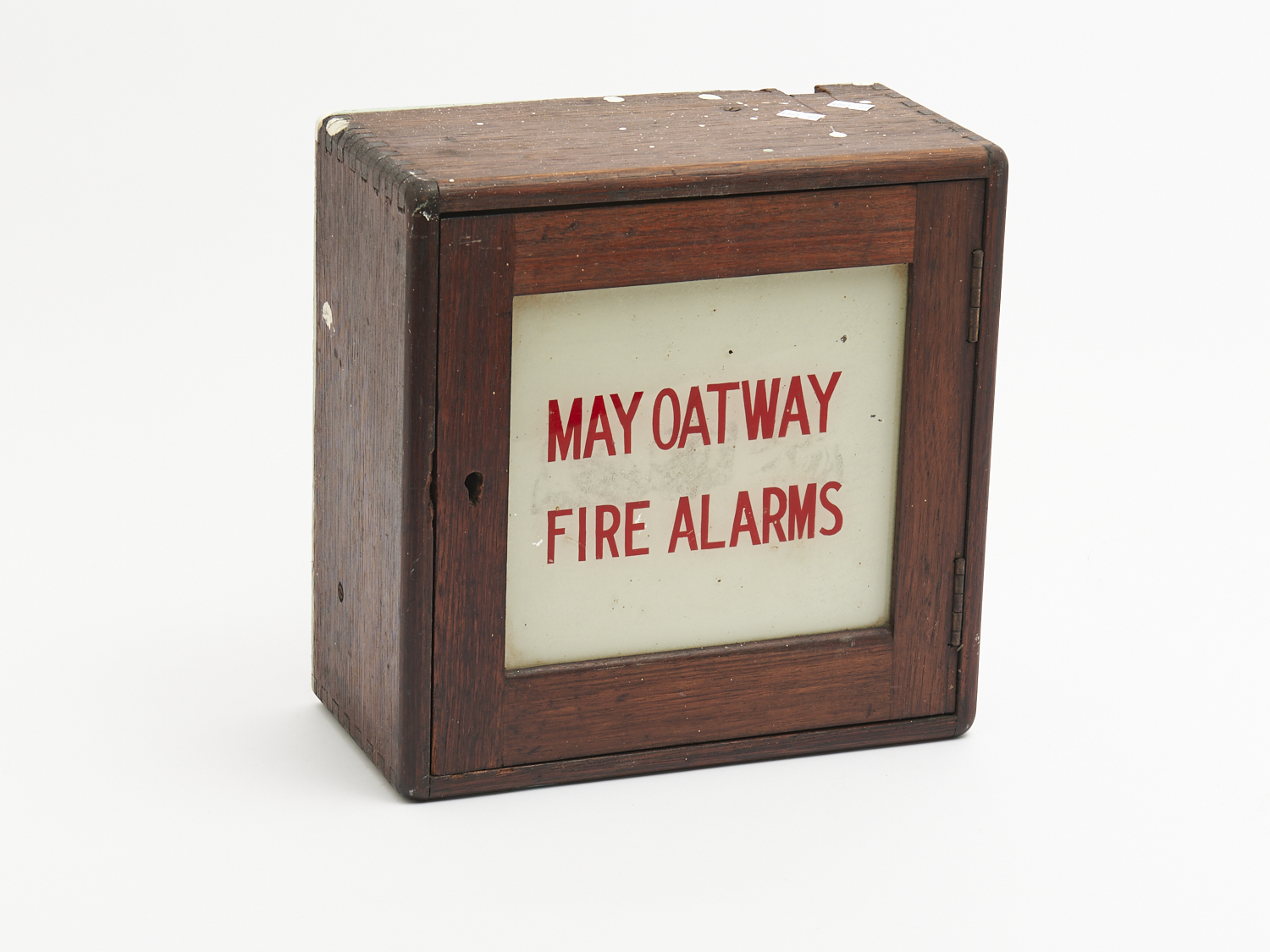 AN AUSTRALIAN BLACKWOOD FRAMED MAY OTWAY FIRE ALARMS WALL MOUNTED CABINET H.31 X W.31 X D.15CM, LEONARD JOEL LOCAL DELIVERY: MEDIUM