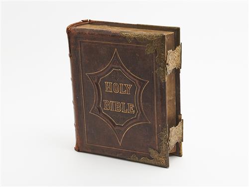 AN IRISH JOHN BROWN LEATHER AND BRASS BOUND FAMILY BIBLE C.1880 33 X 27CM, LEONARD JOEL LOCAL DELIVERY: SMALL