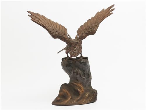 A VINTAGE BRONZED CAST IRON EAGLE FIGURE ON NATURALISTIC ROCKY OUTCROP BASE H.50CM, LEONARD JOEL LOCAL DELIVERY: MEDIUM