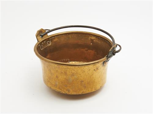 A FRENCH BRASS AND WROUGHT IRON SWING HANDLED PRESERVING PAN DIA.31CM, LEONARD JOEL LOCAL DELIVERY: MEDIUM