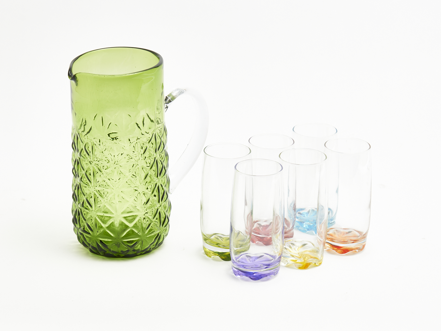 A SEVEN PIECE HARLEQUIN GLASS JUG AND TUMBLER DRINK SET H.25.5CM (TALLEST), LEONARD JOEL LOCAL DELIVERY: MEDIUM