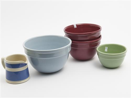 FIVE AUSTRALIAN FOWLER WARE POTTERY MIXING BOWLS TOGETHER WITH A BLUE AND WHITE FOWLER WARE JUG DIA.22.5 (LARGEST), LEONARD JOEL LOCAL DELIVERY: MEDIUM
