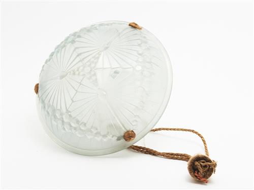 AN ART DECO FROSTED GLASS HANGING CEILING LIGHT WITH SILK CORDS DIA.34.5CM, LEONARD JOEL LOCAL DELIVERY: SMALL