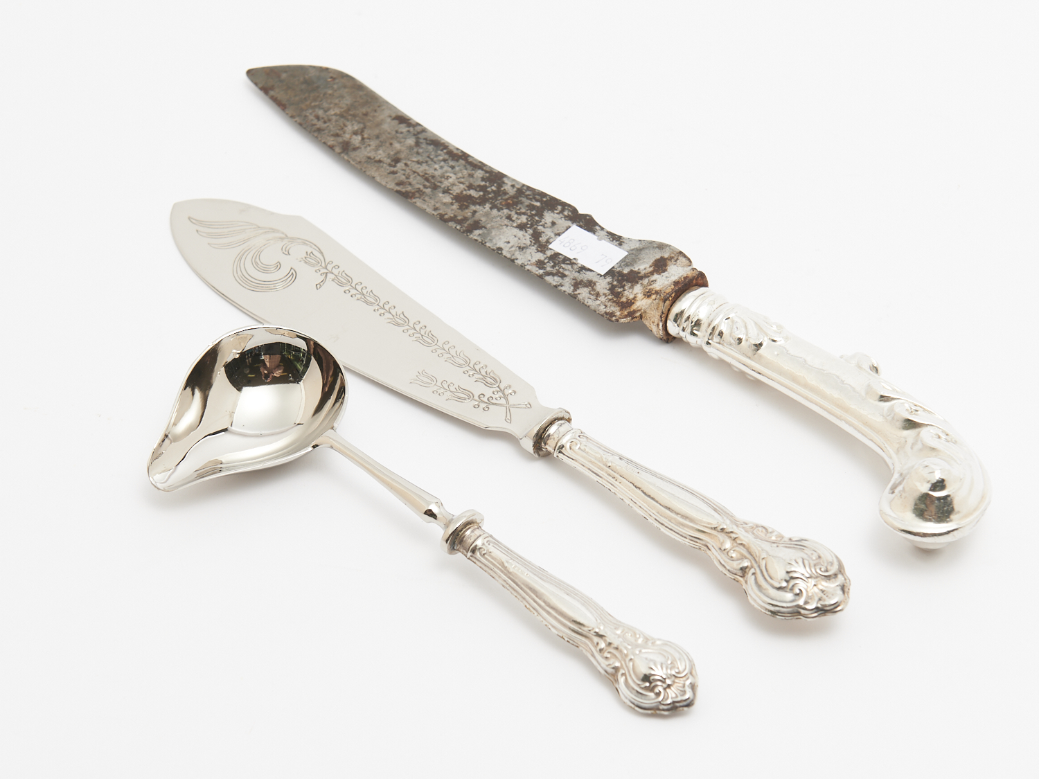 THREE SILVER HANDLED SERVING ITEMS INCLUDING A CAKE SLICE, CARVING KNIFE, AND LADLE L.31CM (LONGEST), LEONARD JOEL LOCAL DELIVERY: SMALL