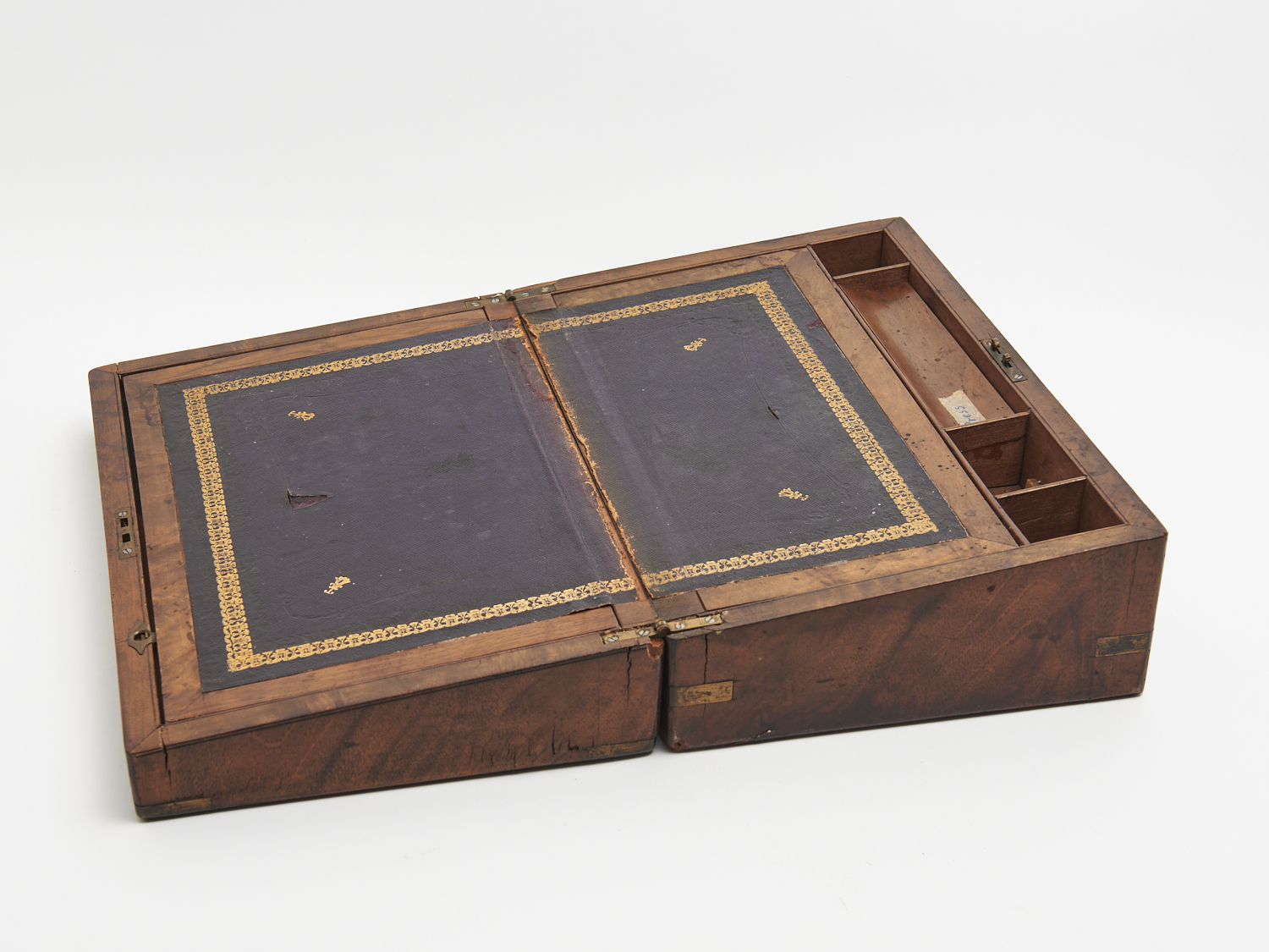 A 19TH CENTURY HARDWOOD BRASS MOUNTED WRITING SLOPE WITH BROWN LEATHER INTERIOR L.40.5 X W51CM, LEONARD JOEL LOCAL DELIVERY: MEDIUM