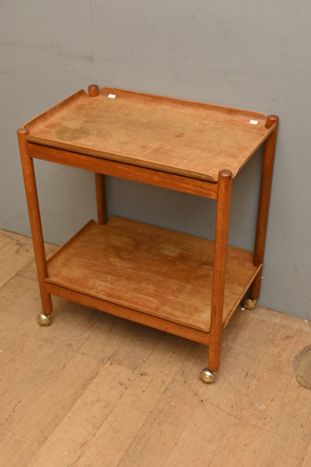 A RETRO TEAK TWO TIER AUTO TROLLEY (A/F) (70H X 63W X 41D CM) (LEONARD JOEL DELIVERY SIZE: LARGE)