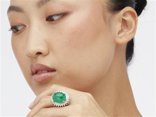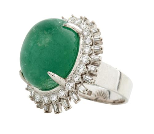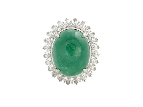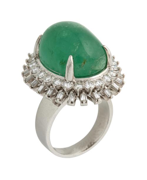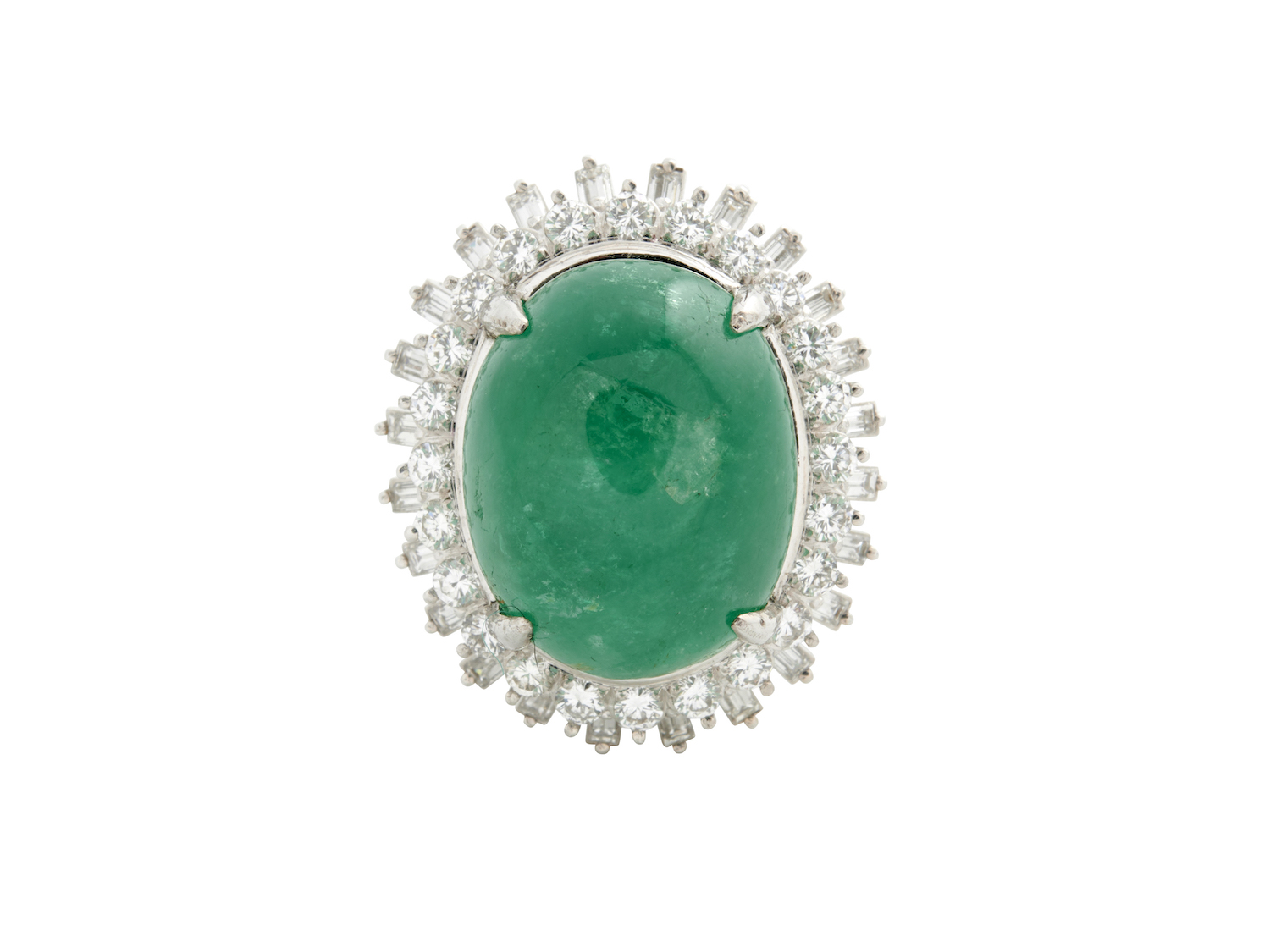 Of cluster design, centring a claw-set oval emerald cut en cabochon weighing approximately 15.0 carats, within a surround of brilliant and baguette-cut diamonds together weighing approximately 0.85 carats, size L 1/2.