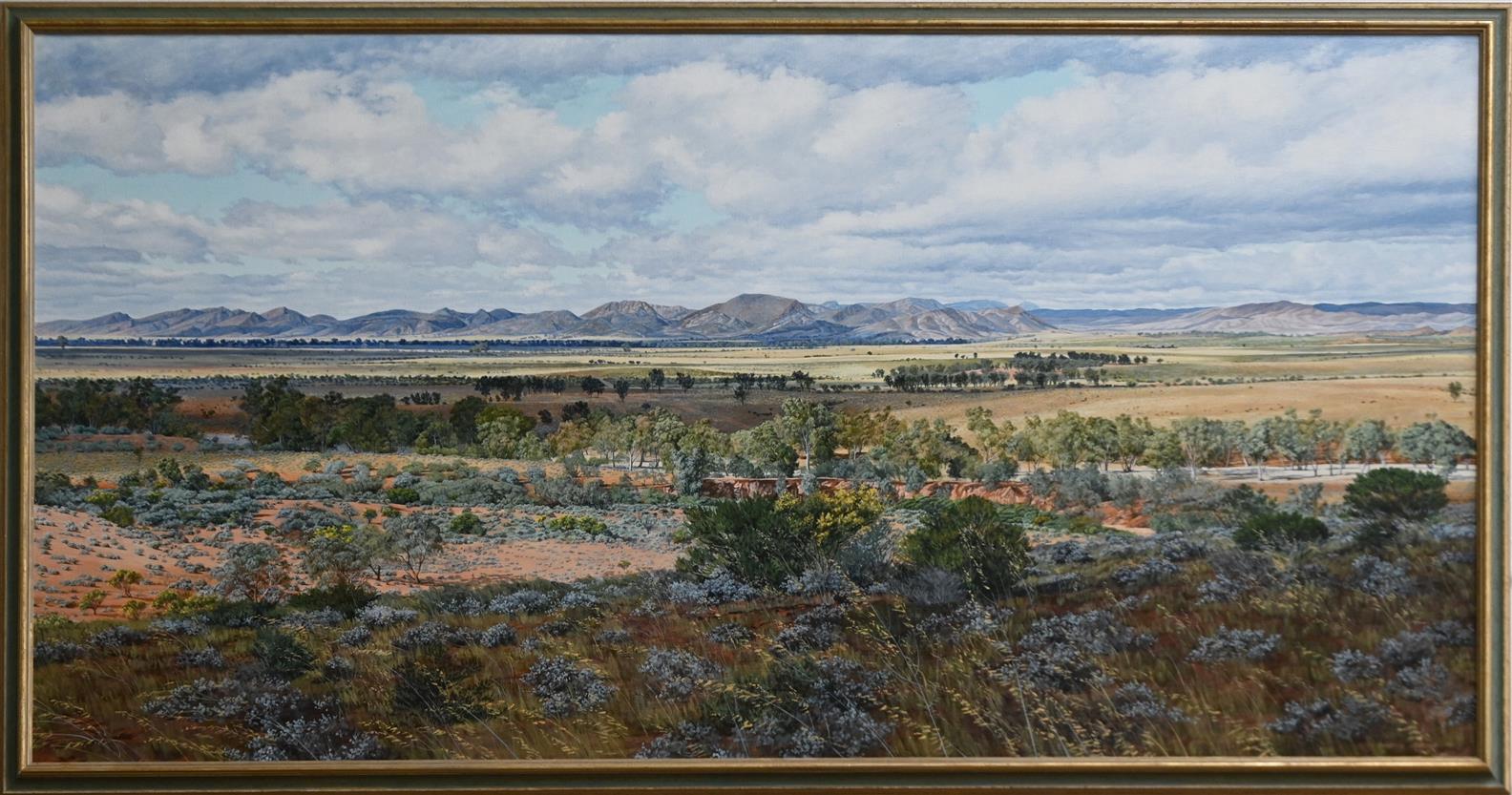 CHRISTINE LAWRENCE, AUSTRALIAN LANDSCAPE 1991, OIL ON CANVAS, SIGNED AND DATED LOWER RIGHT, 100 X 197CM, FRAME SIZE: 112 X 209CM