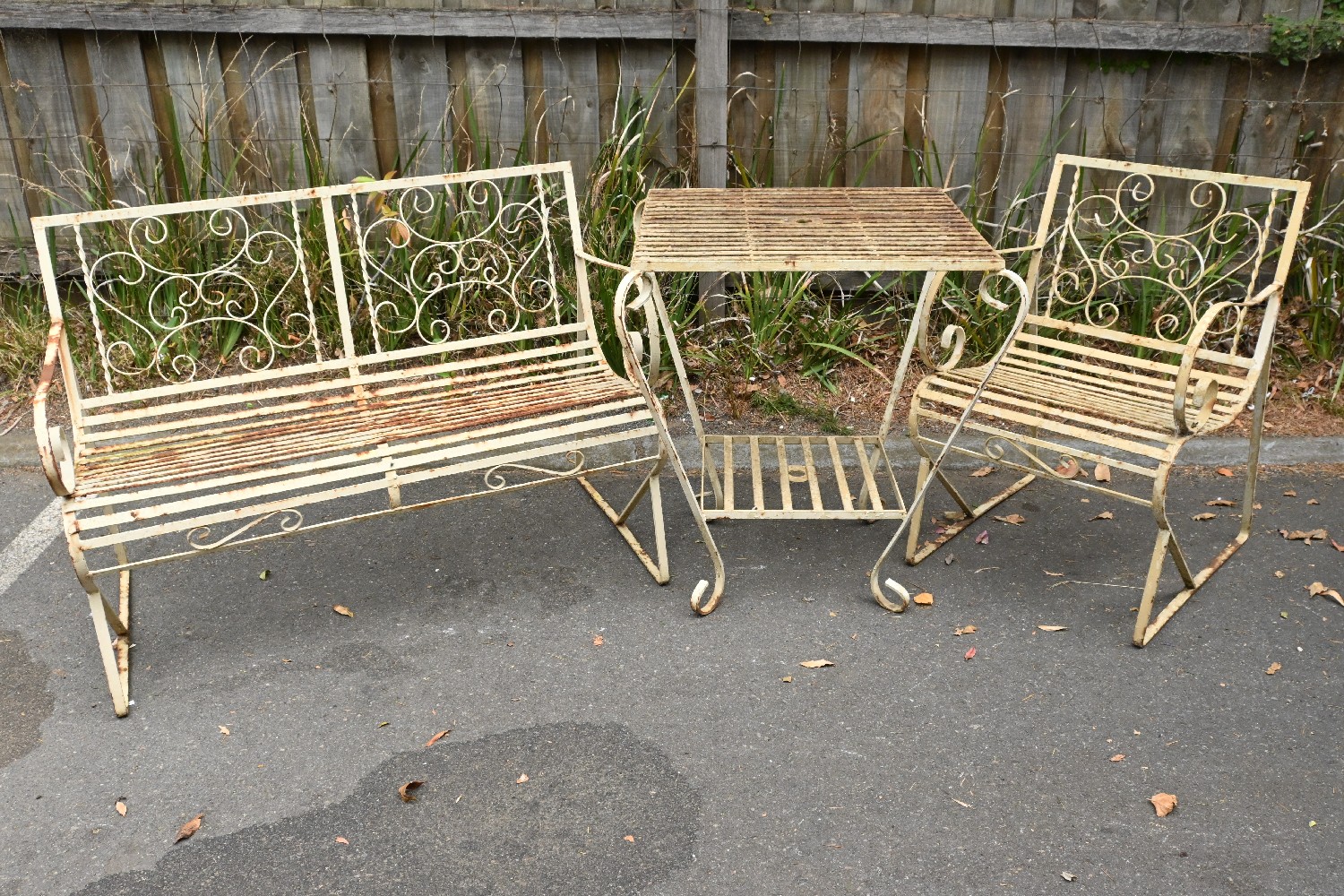 A FRENCH WROUGHT IRON THREE PIECE OUTDOOR SETTING (A/F) (79H X 107W X 65D CM) (LEONARD JOEL DELIVERY SIZE: X-LARGE)