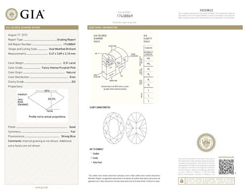 a GIA report numbered 17438869, dated 17 August 2015, stating that the 0.31 carat diamond is natural, Fancy Intense Purplish-Pink colour, SI2 clarity.