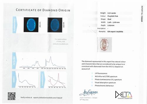 a Delta Diamond Laboratory Certificate of Diamond Origin numbered 1795538, dated 26 May 2022, stating that the 0.31 carat diamond is natural Purplish-Pink colour with characteristics consistent of diamonds from the Argyle deposit, Western Australia;