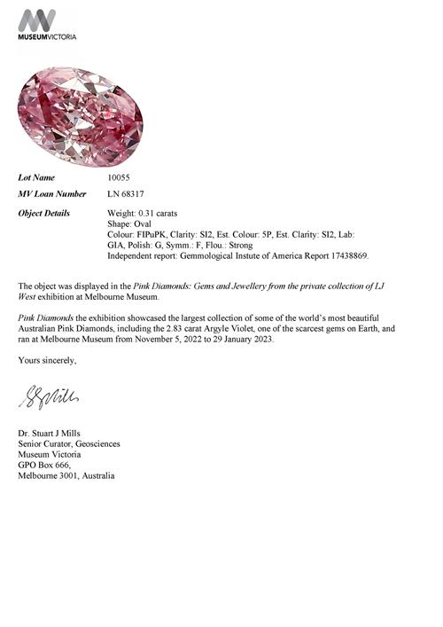 a letter from Museum Victoria stating that this object was displayed in the Pink Diamonds: Gems and Jewellery from the Private Collection of LJ West exhibition at Melbourne Museum from 5 November 2022 to 29 January 2023.