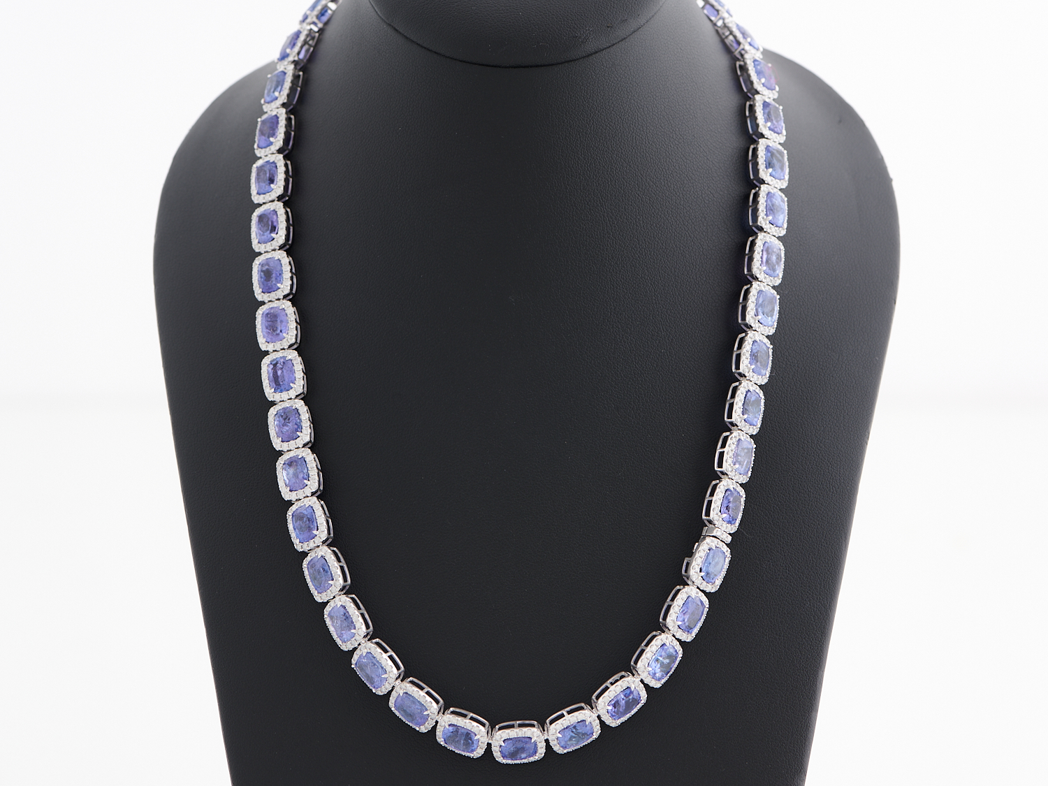 A TANZANITE AND DIAMOND NECKLACE IN 14CT WHITE GOLD, COMPRISING 43 CUSHION-CUT CLAW SET TANZANITES TOTALLING 73.81CTS, WITH DIAMONDS TOTALLING 10.99CT, TOTAL LENGTH APPROXIMATELY 510MM, WEIGHING 58.0GMS, ACCOMPANIED BY A VALUATION