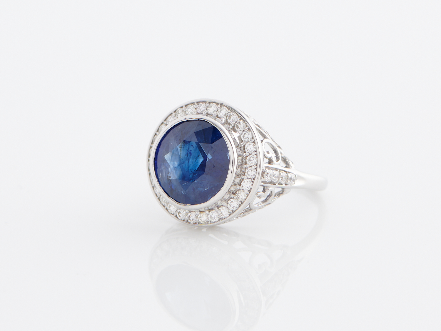 A CEYLON SAPPHIRE AND DIAMOND RING IN 14CT WHITE GOLD, THE ROUND BRILLIANT CUT SAPPHIRE ESTIMATED AT 5.14CT, WITH DIAMONDS TOTALLING 0.44CT, SIZE M, TOTAL WEIGHT 4.7GMS, ACCOMPANIED BY A VALUATION