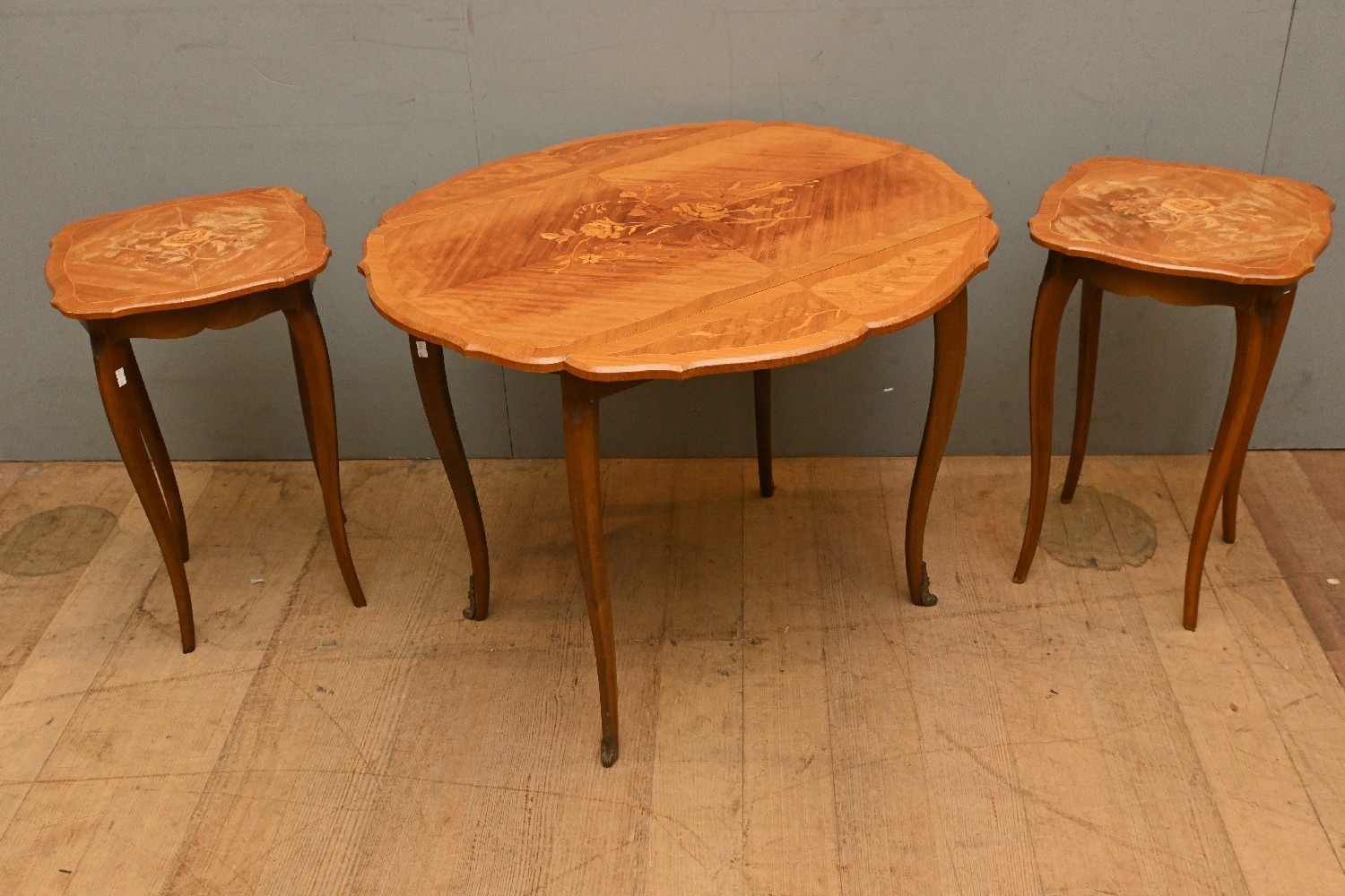 A SET OF LOW TABLES IN ANTIQUE MANNER – A DROP-SIDE TABLE AND A PAIR OF SMALLER TABLES, EACH WITH INLAID FLORAL DECORATION TO THE TOP (A/F) (57H X 69D CM) (LEONARD JOEL DELIVERY SIZE: LARGE)