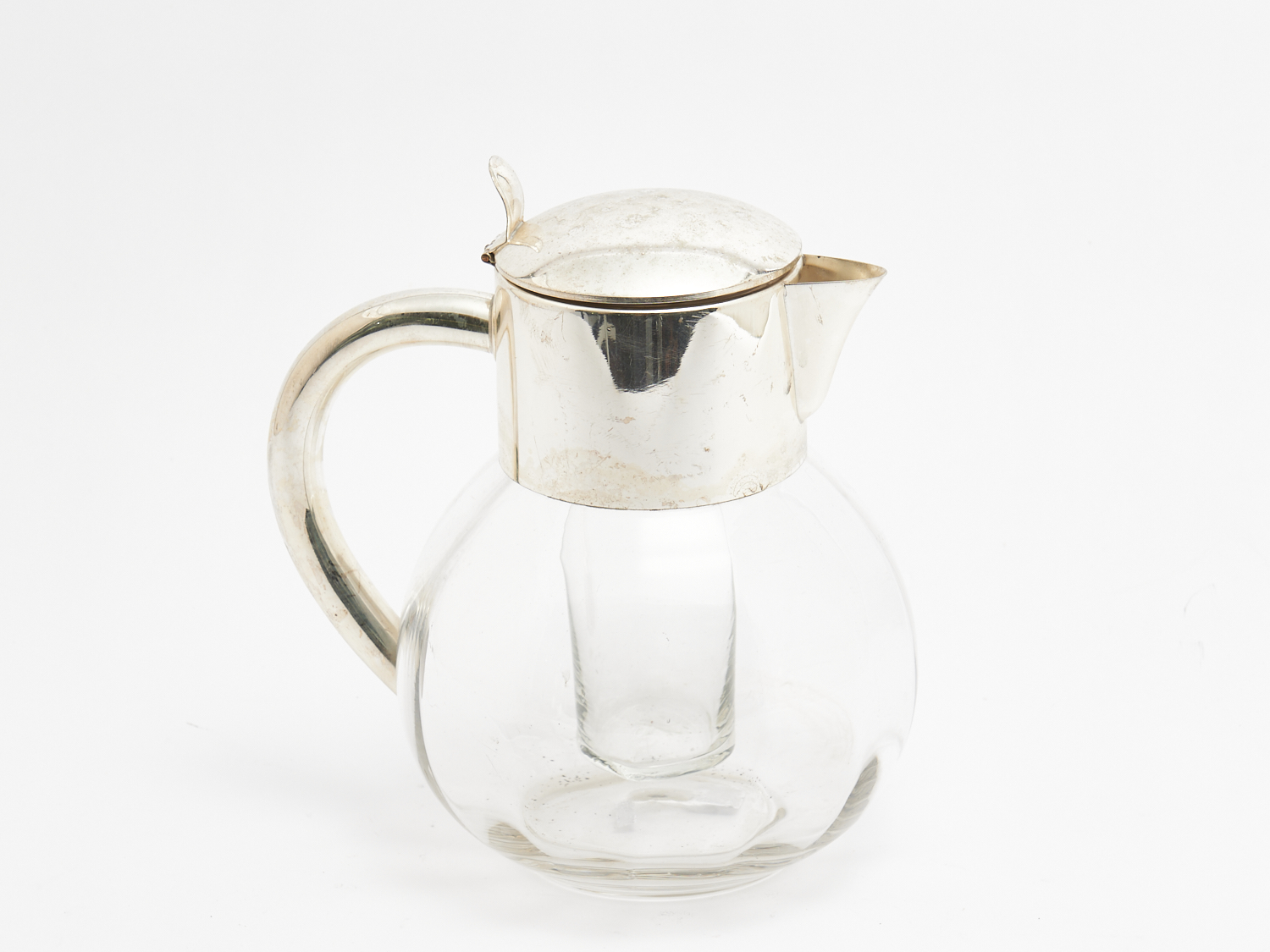 AN ART DECO SILVERPLATE AND GLASS LEMONADE JUG WITH INTERNAL ICE COOLER H.24.5CM, LEONARD JOEL LOCAL DELIVERY: SMALL
