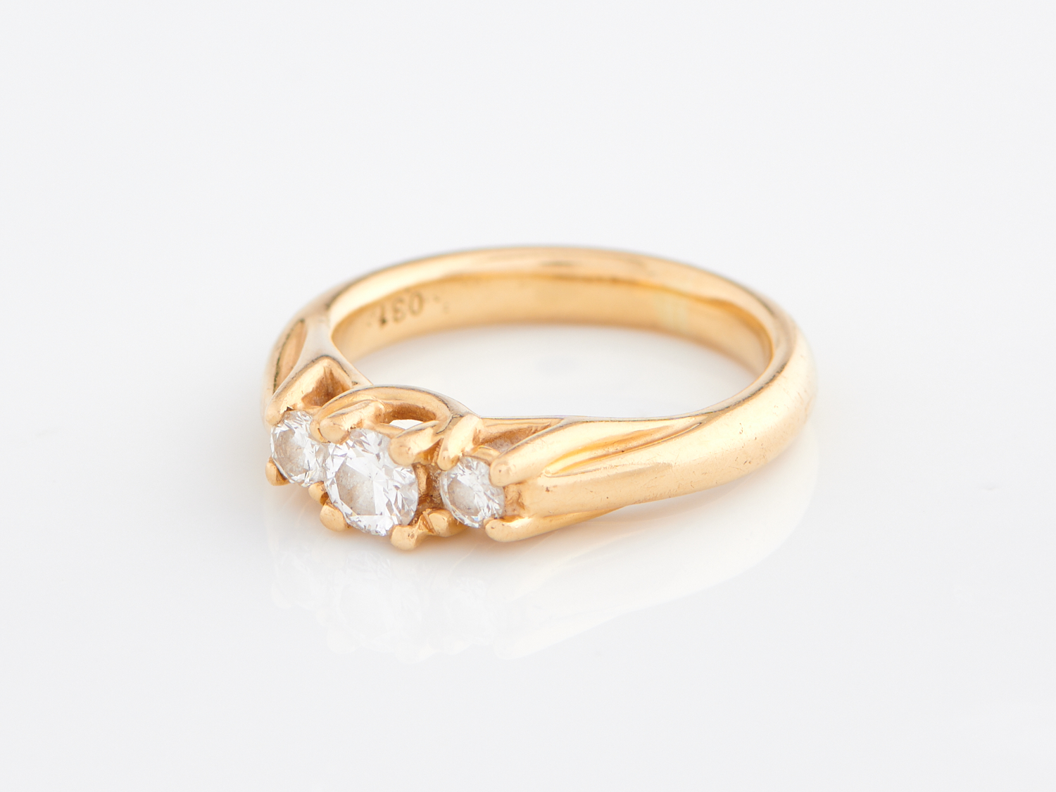 A THREE STONE DIAMOND SET RING IN 18CT GOLD, RING SIZE M, WEIGHT 6.5GMS