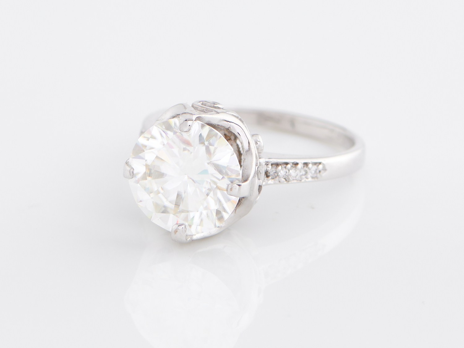 A MOISSANITE AND DIAMOND SET RING IN 18CT WHITE GOLD, MOISSANITE IS 3.32CT, LASER INSCRIBED WITH 1D CARD, DIAMONDS TOTAL 0.10CT, RING SIZE M