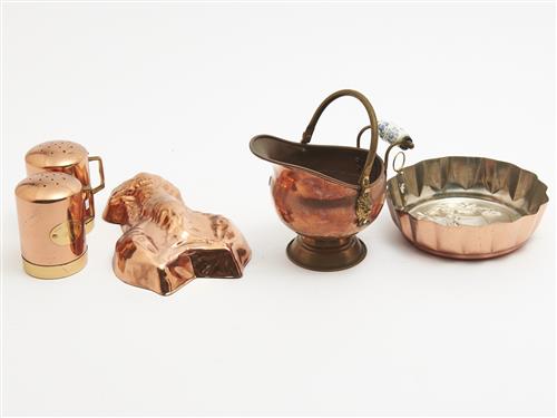 FIVE PIECES OF COPPER WARE INCLUDING TWO JELLY MOULDS AND A PAIR OF SALT SHAKERS L.28CM LEONARD JOEL LOCAL DELIVERY: MEDIUM