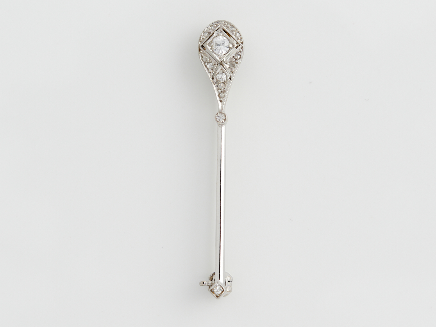 A DIAMOND LAPEL PIN BROOCH IN 14CT WHITE GOLD AND PLATINUM, LENGTH APPROXIMATELY 38MM, 2.5GMS