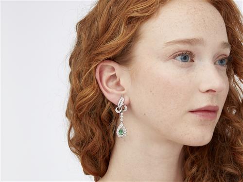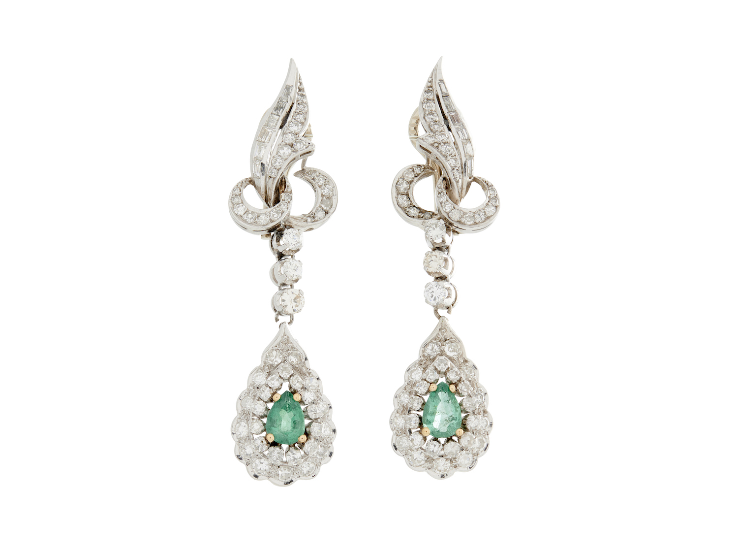 Each earring comprising a claw-set pear-cut emerald, within a surround of brilliant-cut cut diamonds, suspended below a three diamond drop, to a brilliant and baguette-cut diamond scroll surmount, the emeralds together weighing approximately 0.98 carats, the diamonds together weighing approximately 1.80 carats, to post and clip fittings, length approximately 55mm.