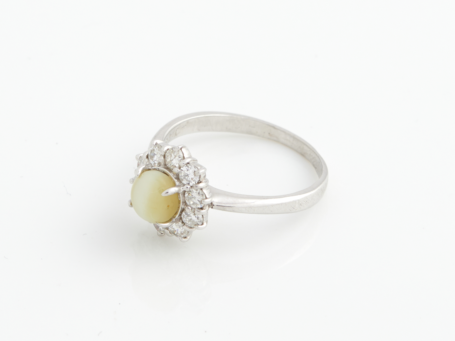 A CHRYSOBERYL AND DIAMOND SET CLUSTER RING IN PLATINUM, RING SIZE L1/2