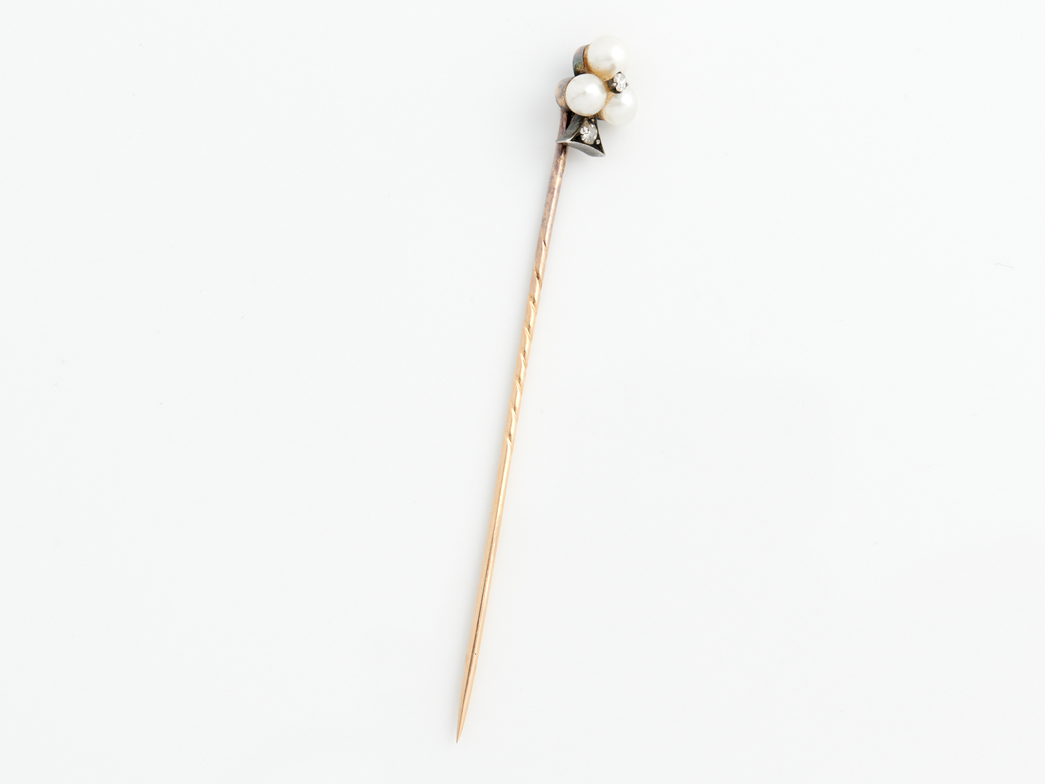 A CULTURED PEARL AND DIAMOND SET PIN IN GOLD, LENGTH APPROXIMATELY 80MM