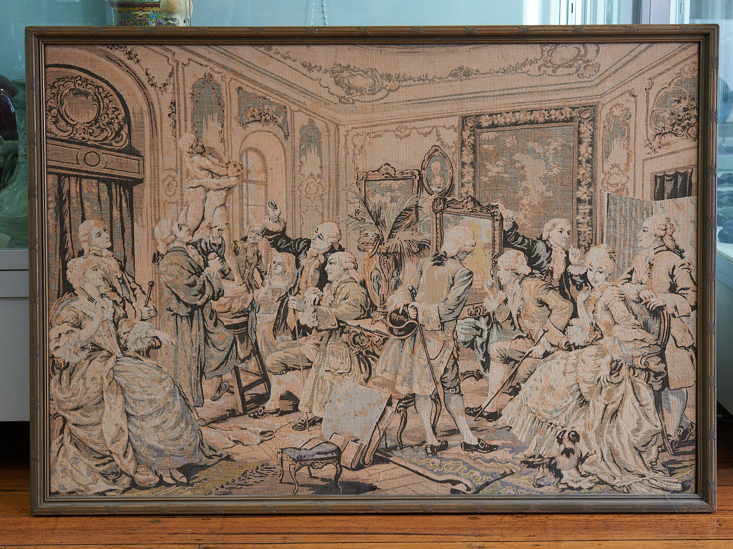 A FRAMED TAPESTRY OF AN EIGHTEENTH-CENTURY SCENE OF FIGURES IN A SALON 71 X 100.5CM, LEONARD JOEL DELIVERY SIZE: MEDIUM