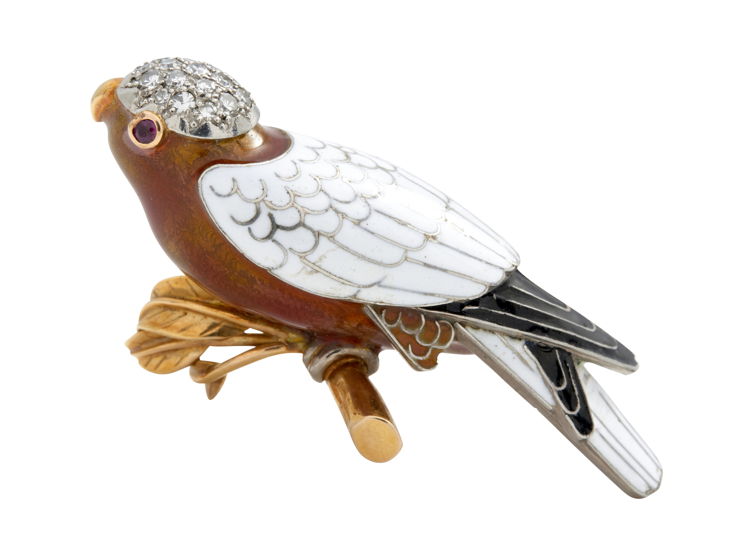 Modelled as a parrot perched on a branch, the body and plumage in orange, black and white enamel, with a diamond set head and ruby set eyes, measuring approximately 54mm x 28mm.