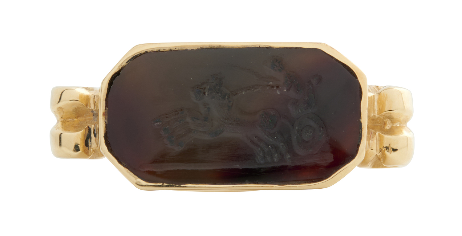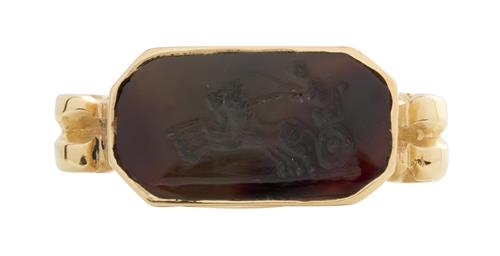 Comprising a bezel-set agate intaglio depicting a chariot and rider, size T-U.