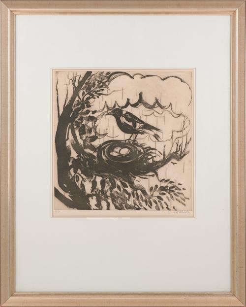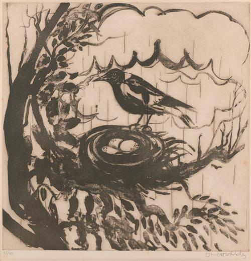 Created in 1977, Brett Whiteley's 'Magpie' captures the beauty and mystique of the Australian bird through the use of striking black etched imagery. Intricately detailed, Whiteley's fascination with birds and their lyrical qualities are evident. "People ask me 'why paint birds?' and I look at them dumbfounded! I've got no answer, except that they are the most beautiful creatures."