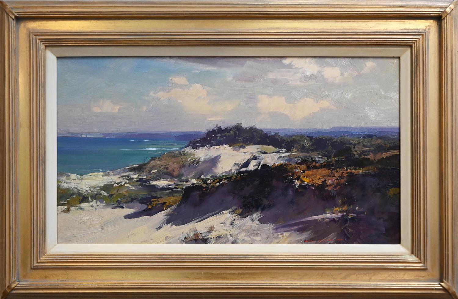 KEN KNIGHT, COASTAL LANDSCAPE, OIL ON BOARD, SIGNED LOWER LEFT, 57 X 75CM, FRAME SIZE: 77 X 94CM