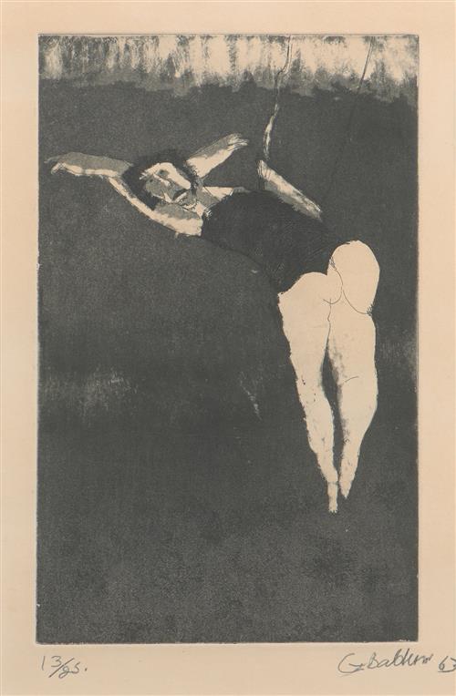 "Trapeze 1963 was etched in Milan while Baldessin was attending the Brera Academy, after leaving London where he, like (Fred) Williams, had attended the Chelsea School of Art. Trapeze was Baldessin's first print to be publicly shown, in the touring exhibition 'Australian Print Survey' of 1963-64. It was the first etching seen by Tate Adams who, impressed by young Baldessin, offered him a part-time lectureship in the RMIT print department of which Adams had been appointed Head in 1960. The etching plate, inked and varnished, was later hung on the wall of the Crossley Gallery." (Robert Lindsay p. 40)