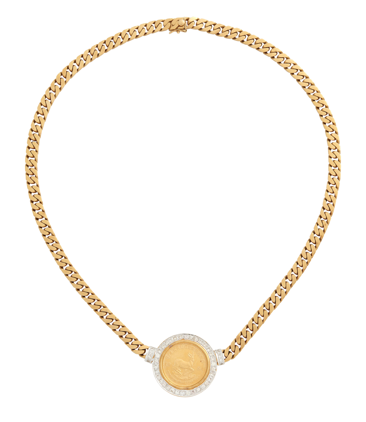 Centring a 1984 1/4 Krugerrand within a surround of brilliant-cut diamonds together weighing approximately 1.00 carat, to a flat curblink chain, completed by a concealed box clasp, length approximately 490mm, gross weight approximately 76.3 grams.