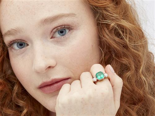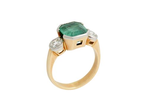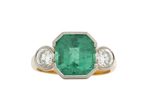 Centring a semi-bezel set emerald-cut emerald weighing approximately 5.40 carats, flanked by bezel-set brilliant-cut diamonds together weighing approximately 1.26 carats, size V.