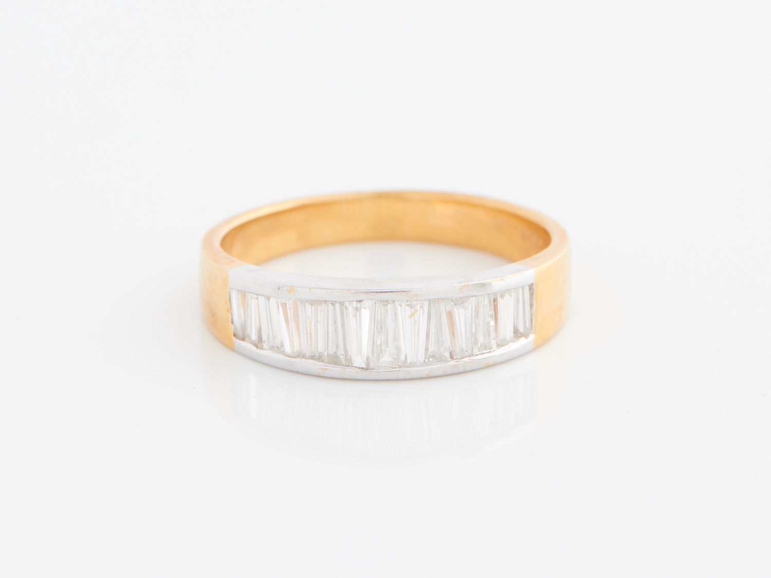 A HALF HOOP TAPERED BAGUETTE-CUT DIAMOND RING IN TWO-TONE 18CT GOLD, SIZE T, 5.3GMS