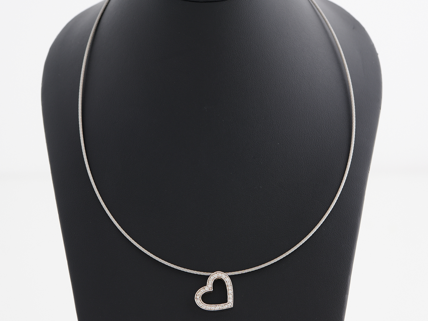 A DIAMOND SET HEART PENDANT IN 18CT WHITE GOLD, MEASURING 19MM X 19MM, TO A WIRE OMEGA COLLAR