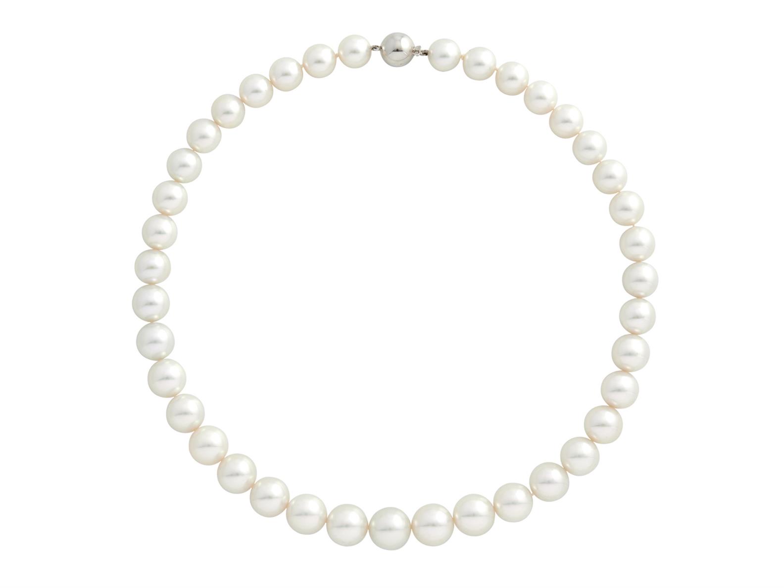 Comprising thirty-nine graduating pearls of silver white hues measuring approximately 12.50mm to 15.30mm, completed by a ball clasp in 14ct white gold, length 550mm.