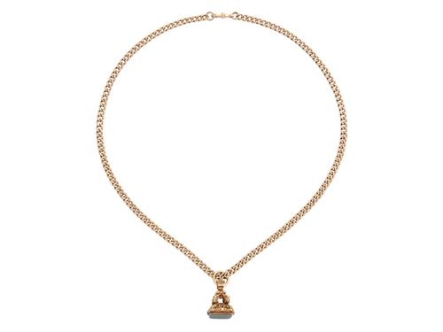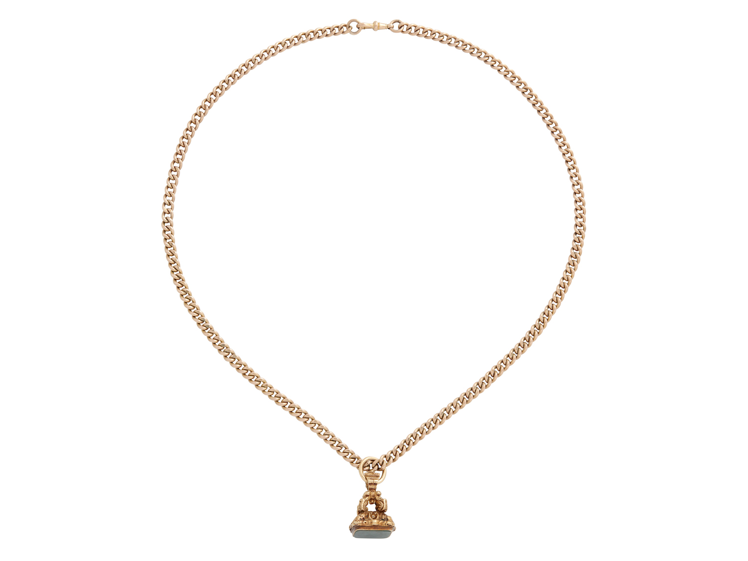 The curblink chain completed by a swivel clasp and suspending a bloodstone seal, London hallmarks, seal length approximately 30mm, chain length approximately 650mm, gross weight approximately 79.8 grams.