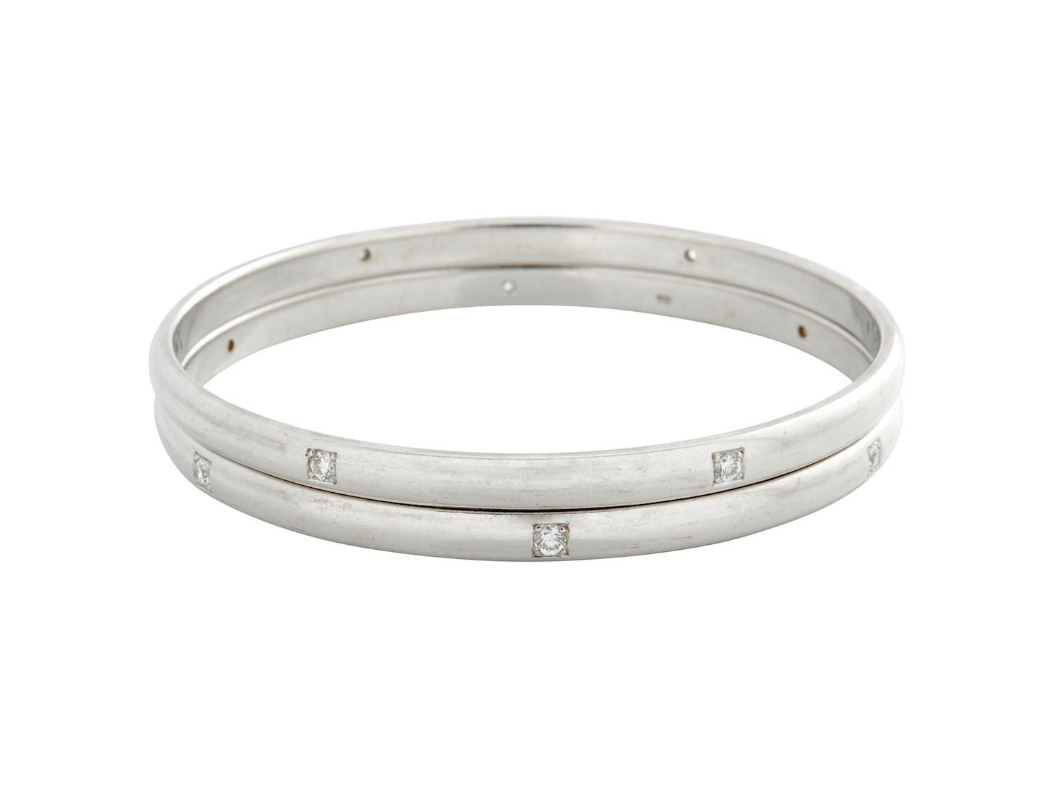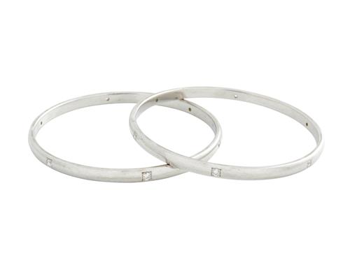 Each round bangle flush-set with six brilliant-cut diamonds together weighing approximately 1.20 carats, inner diameter approximately 200mm, gross weight approximately 82.3 grams.