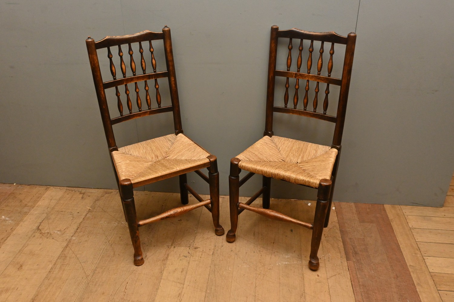 A PAIR OF 19TH CENTURY LANCASHIRE ELM SPINDLE-BACK SIDE CHAIRS, WITH RUSH SEATS (A/F) (99H X 47W X 40D CM) (LEONARD JOEL DELIVERY SIZE: LARGE)