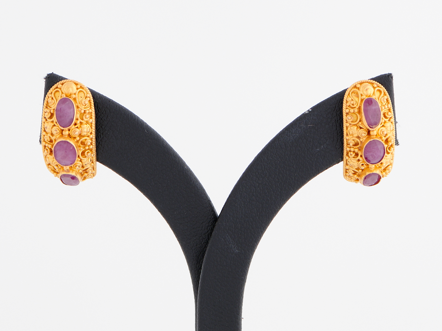 A PAIR OF BALINESE RUBY SET EARRINGS, TO POST AND BUTTERFLY FITTINGS IN 22CT GOLD, 6GMS