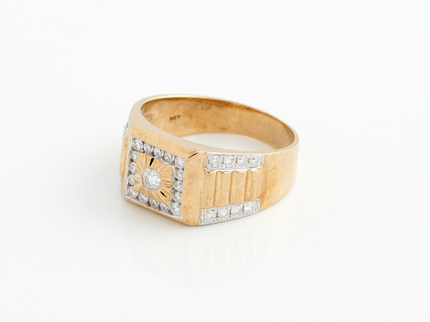 A DIAMOND SET RING IN 9CT GOLD, COMPRISING A CENTER GYPSY SET DIAMOND SURROUNDED BY A BORDER OF CHANNEL SET ROUND BRILLIANT CUT DIAMONDS AND SHOULDERED BY ADDITION MILLEGRAIN SET DIAMONDS, THE DIAMONDS TOTALLING APPOXIMATELY 0.62CT, RING SIZE V, 6.8GMS