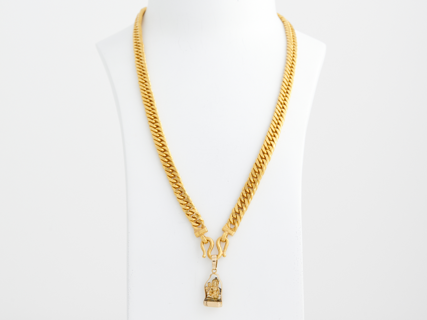 A CURBLINK CHAIN IN 24CT GOLD, TOGETHER WITH A GOLD PLATED CHARM, TO AN M HOOK CLASP, 166.7GMS