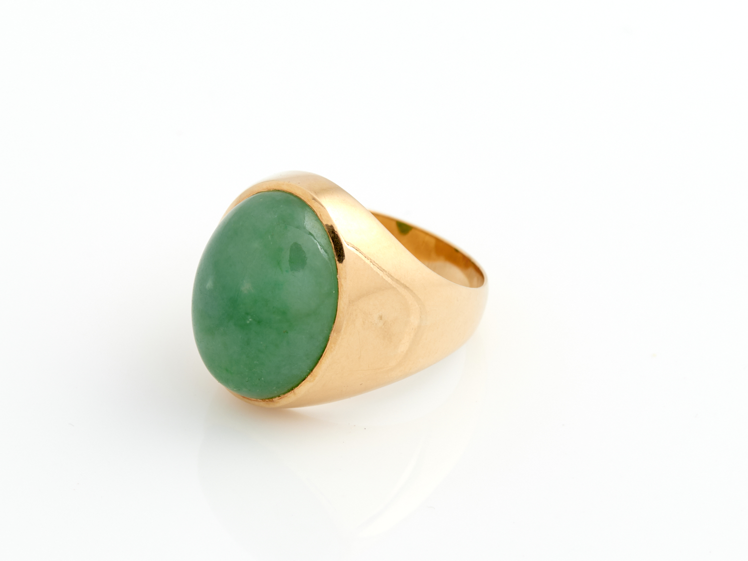 AN OVAL CABOCHON JADEITE RING IN 14CT GOLD, RING SIZE T, ACCOMPANIED BY A GIA REPORT NUMBER 2457221401 STATING JADE IS UNTREATED "A" JADE, 12.7GMS
