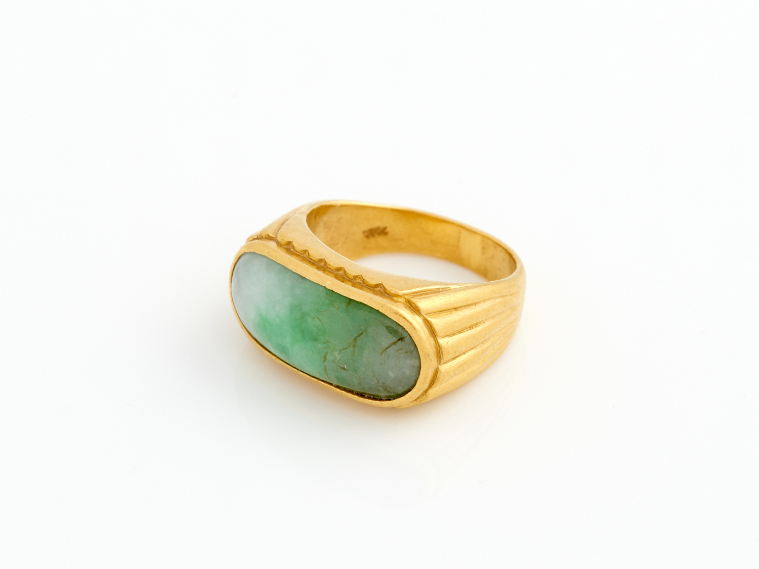 A CABOCHON JADEITE RING IN 22CT GOLD, RING SIZE Q, ACCOMPANIED BY A GIA REPORT NUMBER 3455221398 STATING JADE IS UNTREATED "A" JADE, 13.7GMS