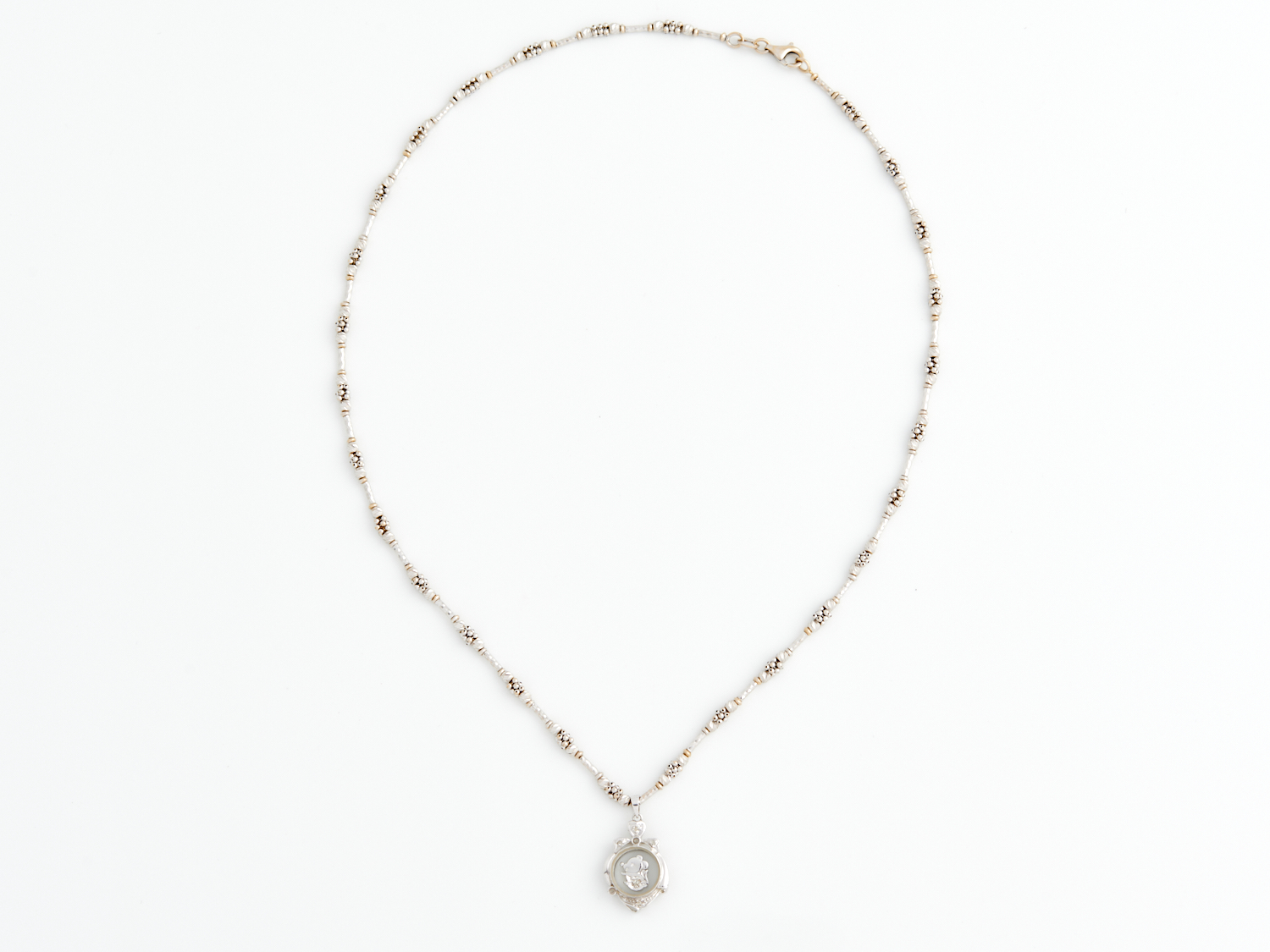 AN ITALIAN DIAMOND SET SPINNING PENDANT NECKLACE IN 18CT WHITE GOLD, THE DIAMONDS TOTALLING 0.02CTS, CHAIN LENGTH 345MM, PENDANT LENGTH 203MM, 12.6GMS