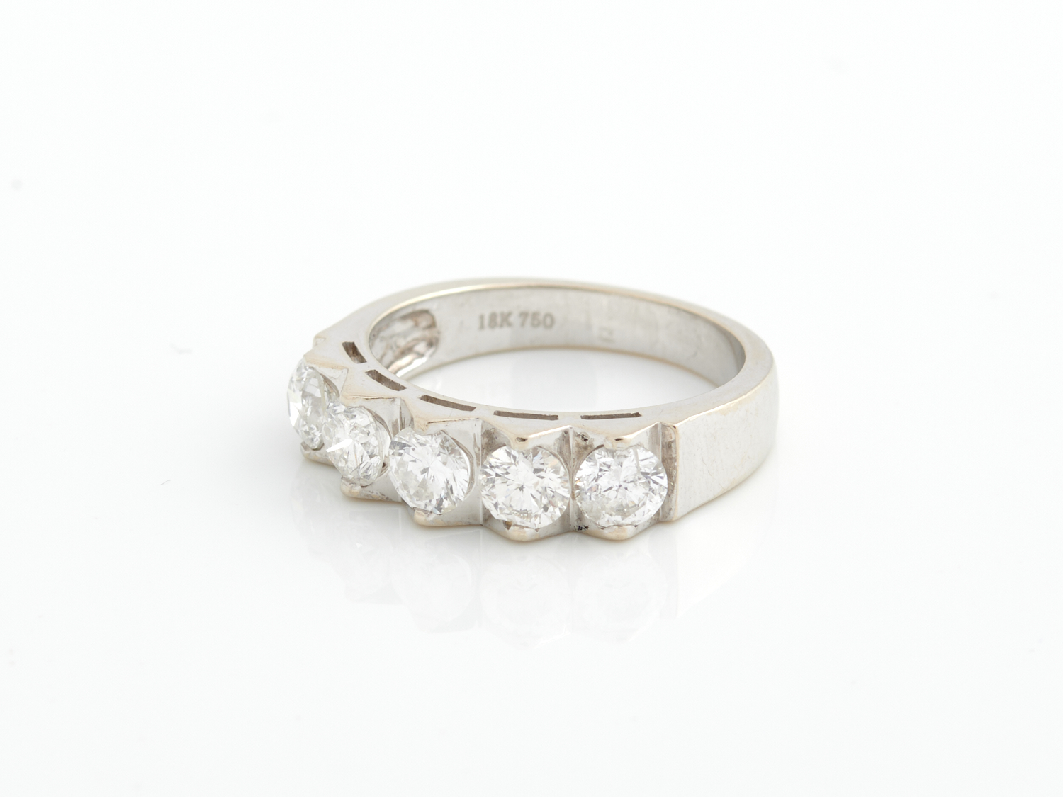 A FIVE STONE DIAMOND RING IN 18CT WHITE GOLD, THE DIAMONDS TOTALLING APPROXIMATELY 1.25CTS (F, P1-2), RING SIZE L 1/2, 4.4GMS