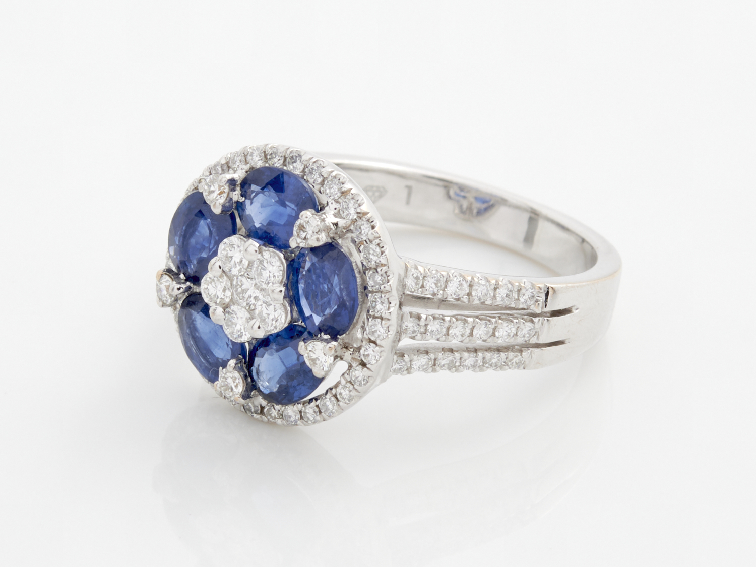 A SAPPHIRE AND DIAMOND CLUSTER RING IN 18CT WHITE GOLD, FEATURING FIVE OVAL CUT SAPPHIRES, ALTERNATING WITH FIVE ROUND BRILLIANT CUT DIAMONDS, AND FEATURING DIAMOND SET SHOULDERS AND HALO, DIAMONDS TOTALLING 0.58CTS, THE SAPPHIRES TOTALLING APPROXIMATELY 1.35CTS, THE BAND MEASURING 2.9MM WIDE, RING SIZE N, 6.4GMS